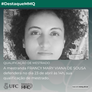 O Programa de Pós-Graduação em Modelagem e Métodos Quantitativos (PPGMMQ) convida a comunidade acadêmica para a defesa de qualificação de mestrado da discente Francy Mary Viana de Sousa, sob orientação do Prof. Dr. André Jalles Monteiro.